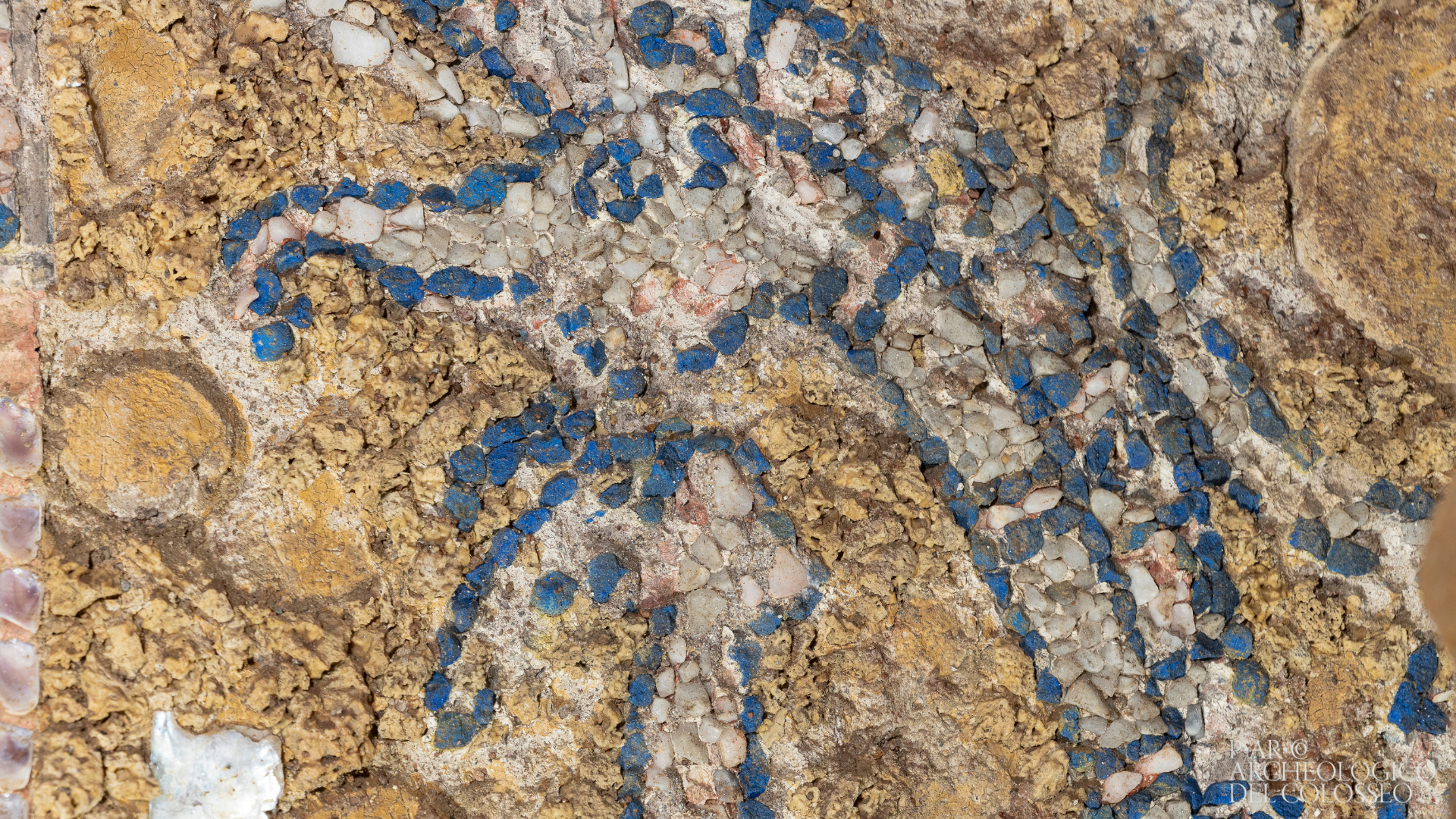 A rendere eccezionale la scoperta è il rinvenimento, in questo ambiente, di uno straordinario rivestimento parietale in mosaico cosiddetto “rustico”, che, per complessità delle scene raffigurate e per cronologia, è privo di confronti. Costituito da conchiglie di diverso tipo, tessere di blu egizio, preziosi vetri, scaglie minute di marmo bianco o di altri tipi di pietre, tartari (ovvero frammenti di travertino spugnoso) e cretoni di pozzolana legati da malta e orditi, il mosaico, che si data agli ultimi decenni del II secolo a.C., presenta una sequenza complessa di scene figurate. Nelle quattro edicole, definite da lesene e decorate con vasi da cui fuoriescono tralci di foglie di loto e di vite, sono raffigurate cataste di armi con trombe di tipo celtico (carnyx), prue di navi con tridente, timoni con triremi che alludono, forse, a un duplice trionfo, terrestre e navale, del proprietario della domus. La grande lunetta soprastante presenta, inoltre, un’affascinante raffigurazione di paesaggio con, al centro, una città, con scogliera simulata con i tartari di travertino, affacciata sul mare solcato da tre grandi navi di cui una con vele sollevate; una cinta muraria con piccole torri circonda la città dotata di portici, porte e di un grande edificio pubblico; su uno dei lati una scena pastorale. La rappresentazione di una città costiera potrebbe alludere a una conquista bellica da parte del proprietario della domus, appartenente a un personaggio aristocratico, presumibilmente di rango senatorio.