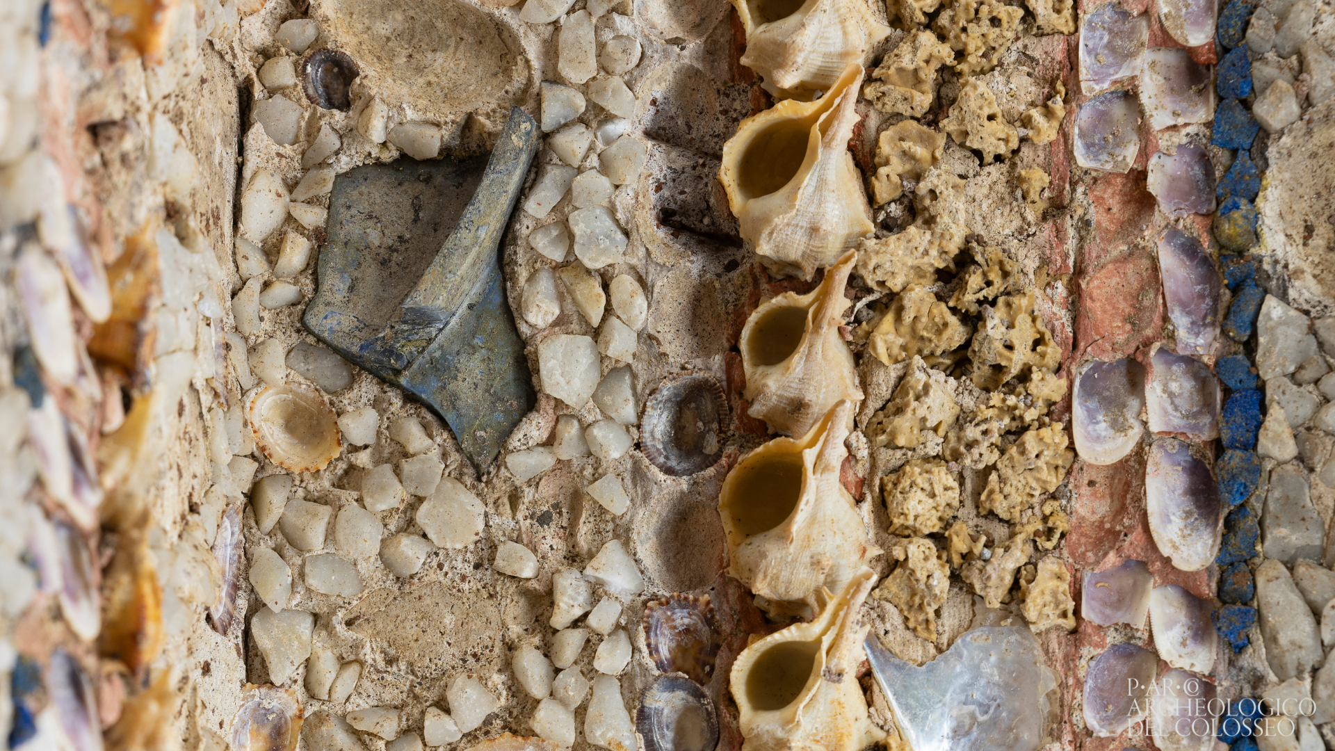 Making the discovery exceptional is the revelation, in this room, of an extraordinary wall covering in so-called ‘rustic’ mosaic, which, in terms of the complexity of the scenes depicted and the chronology, is unparalleled. Consisting of different types of shells, Egyptian blue tesserae, precious glass, minute flakes of white marble or other types of stone, “tartars” (i.e., fragments of “spongy” travertine) and pozzolana pebbles bound by mortar and warps, the mosaic, which dates to the last decades of the 2nd century AD, presents a complex sequence of figurative scenes. In the four aediculae, defined by pilaster strips and decorated with vases from which vines and lotus leaves sprout, are depicted stacks of weapons with Celtic-type trumpets (carnyx), ships’ prows with tridents, and helms with triremes, alluding, perhaps, to a double triumph, terrestrial and naval, of the owner of the domus. The large lunette above also presents a fascinating depiction of a landscape with, in the centre, a city, with a simulated cliff with travertine “tartars”, facing the sea ploughed by three large ships, one of which with raised sails; a wall with small towers surrounds the city with porticoes, gates and a large public building; on one of the sides a pastoral scene. The representation of a coastal city could allude to a warlike conquest by the owner of the domus, belonging to an aristocratic figure, presumably of senatorial rank.