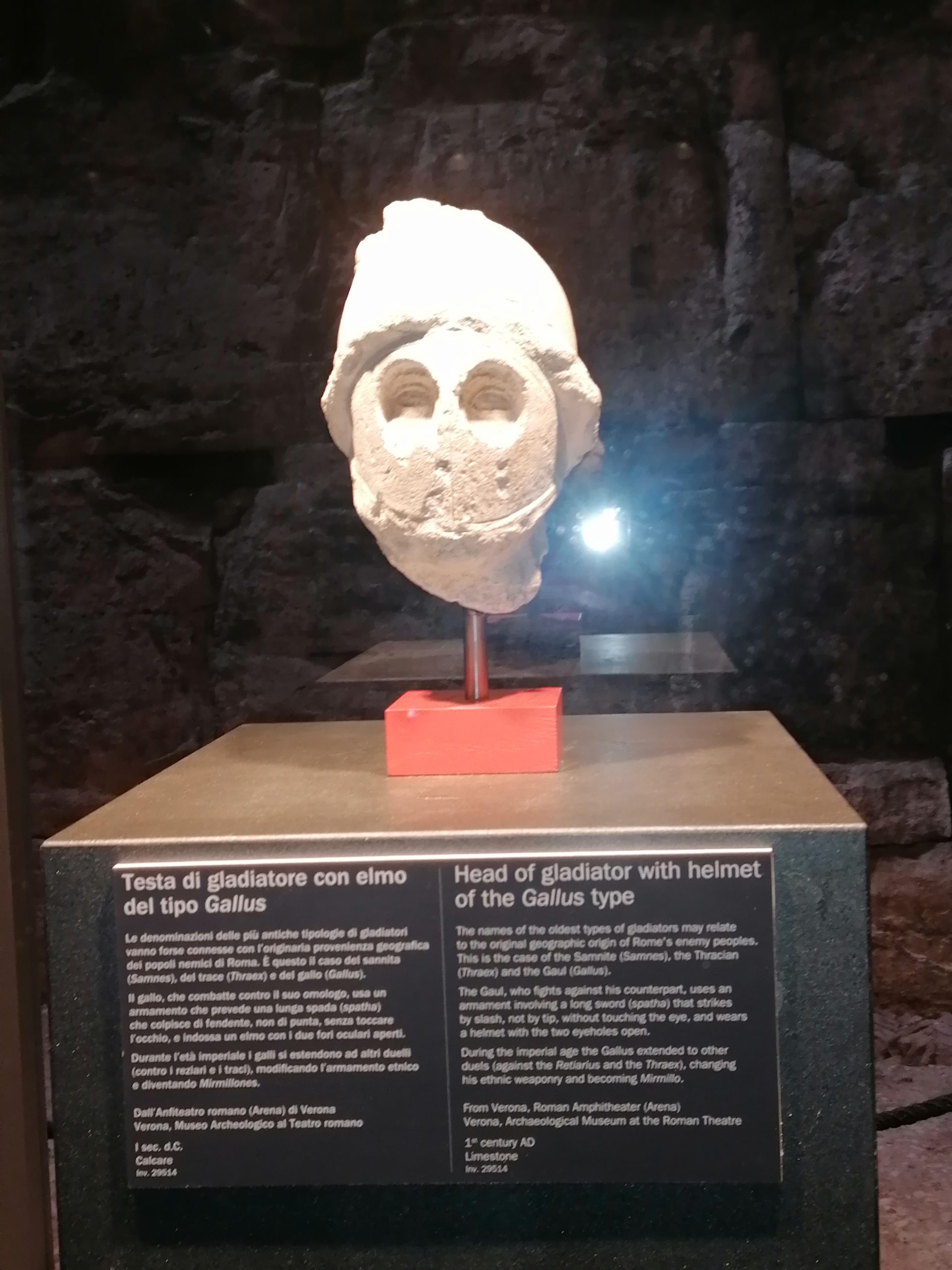 The limestone head found in the Verona arena shows a type of helmet that leaves the two eyeholes open, at a time that precedes eye protection with grids. Thisevolution is attested as early as the Augustan age with the reform of the gladiatorial classes, but it delays imposing itself for the helmet of the contrarete and the Gaul: in the case of the contrarete the eyeholes, which are small, were hardly reached by the trident of the reziario. In the case of the Gaulus fighting against his counterpart, the armor includes a long sword (spatha) that strikes by slash, not by tip, without touching the eye.