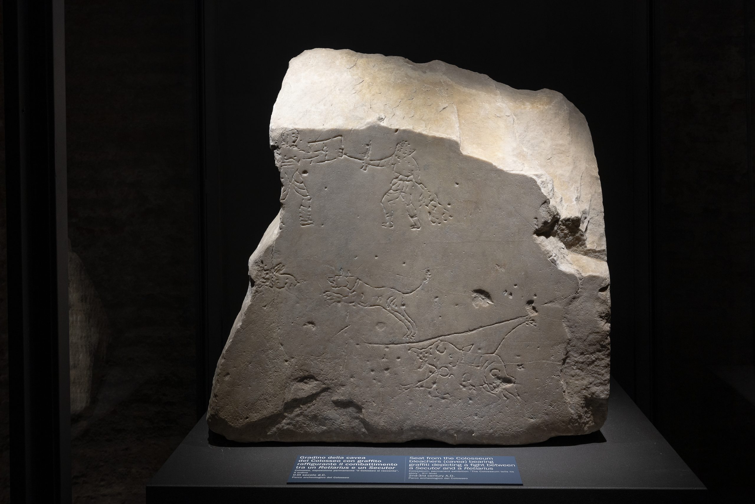 Seat from the Colosseum bleachers (cavea) bearing graffiti depicting a fight between a Secutor and a Retiarius. From the permanent exhibition “The Colosseum tells its history”, Colosseum, 2nd level. 2nd-3rd century A.D.
