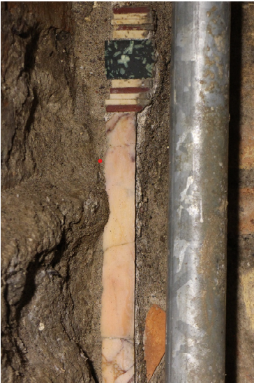 Opus sectile parietale, traccia presente all’angolo tra prospetto est e nord