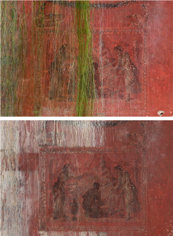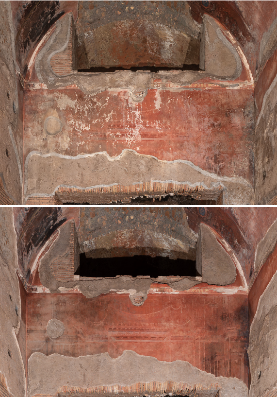 Restoration focused on stabilizing the surfaces, cleaning, and aesthetic recovery of the walls. The interventions included careful removal of biological growth and deposits, consolidation of plaster, stucco, and paint layers, reattachment of detached areas, and sensitive reintegration of missing decoration, respecting the archaeological character of the room.