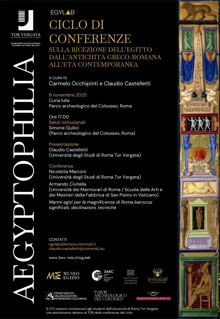 Nel 2024, per iniziativa del Corso di Studi Magistrali in Storia dell’Arte dell’Università degli Studi di Roma Tor Vergata, il Dipartimento di Studi Letterari, Filosofici e di Storia dell’Arte dello stesso Ateneo ha istituito in convenzione col Museo Egizio di Torino il laboratorio di ricerca EgyLab, dedicato alla ricezione dell’Egitto dall’Antichità greco-romana all’età contemporanea, diventato laboratorio didattico a partire dall’anno accademico 2025-2026. Nel quadro delle attività di EgyLab, il Dipartimento ha promosso nel 2025 in convenzione col Parco archeologico del Colosseo un ciclo di conferenze intitolato Aegyptophilia, a cura di Carmelo Occhipinti e Claudio Castelletti, patrocinato dal DiVA – Dipartimento di valorizzazione del patrimonio culturale, dal Museo Egizio di Torino, dall’Accademia d’Egitto, dall’Istituto Finlandese di Roma, dalla Fondazione Marco Besso e dal 3ARC – Ancient Art Architecture Reception Center.
