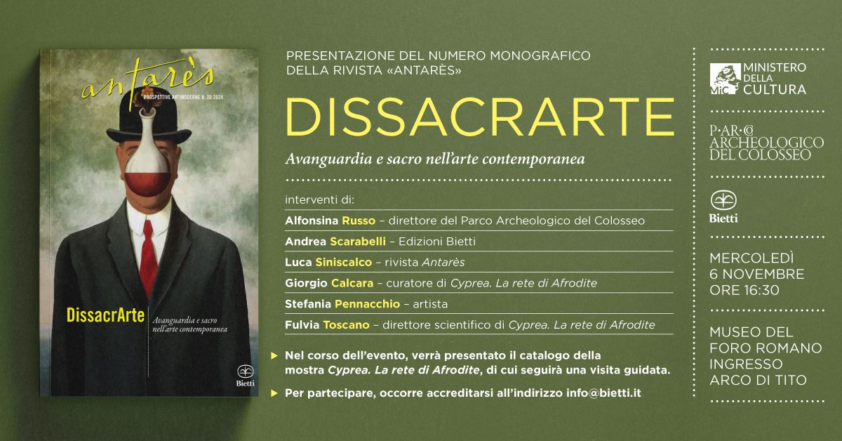Mercoledì 6 novembre, alle 16:30, il Museo del Foro Romano, nel contesto della mostra Cyprea. La rete di Afrodite, ospita la presentazione del numero monografico della rivista «Antarès» dedicato al sacro nell’arte moderna e postmoderna.