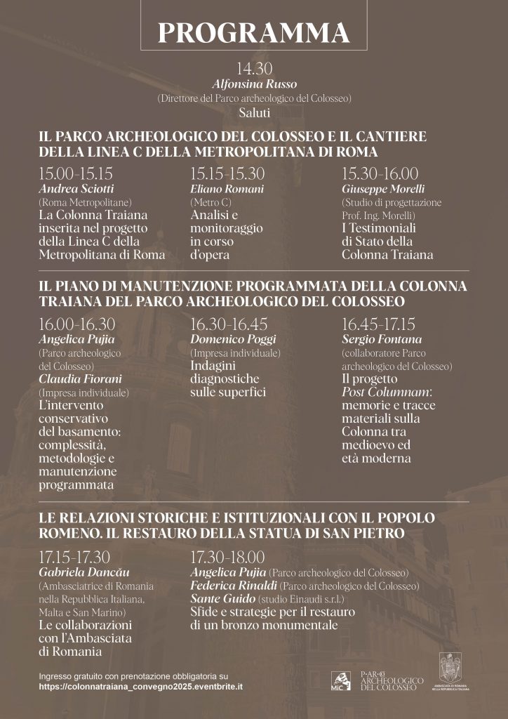 Infine, la nota affezione del popolo romeno ai temi trattati sulla Colonna raffiguranti il racconto delle campagne daciche di Traiano, ha portato ad una collaborazione istituzionale che si è concretizzata in un cofinanziamento destinato a coprire parte dei fondi necessari per il restauro della statua di San Pietro in cima alla Colonna. Nell’anno del Giubileo il bronzo monumentale sarà oggetto di un intervento di manutenzione straordinaria: la progettazione è già in corso e in occasione della giornata di studi saranno condivisi i primi dati preliminari.