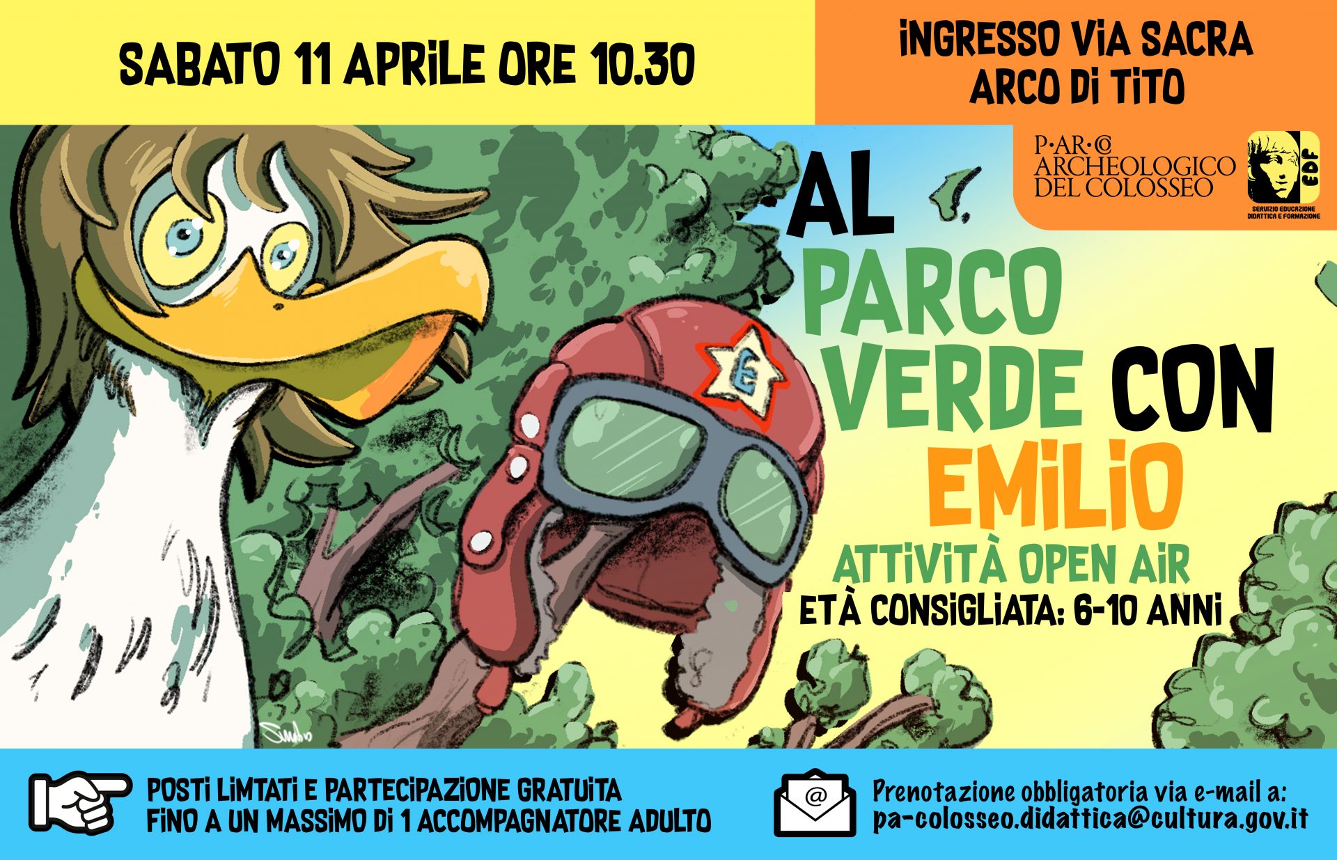 “Al PArCo verde con Emilio” è un laboratorio interamente realizzato all’aperto e ispirato alle avventure del gabbiano Emilio, personaggio che anima le attività del nostro Servizio Educazione, Didattica e Formazione e che accompagna bambini e bambine alla scoperta del Foro Romano e del Palatino.