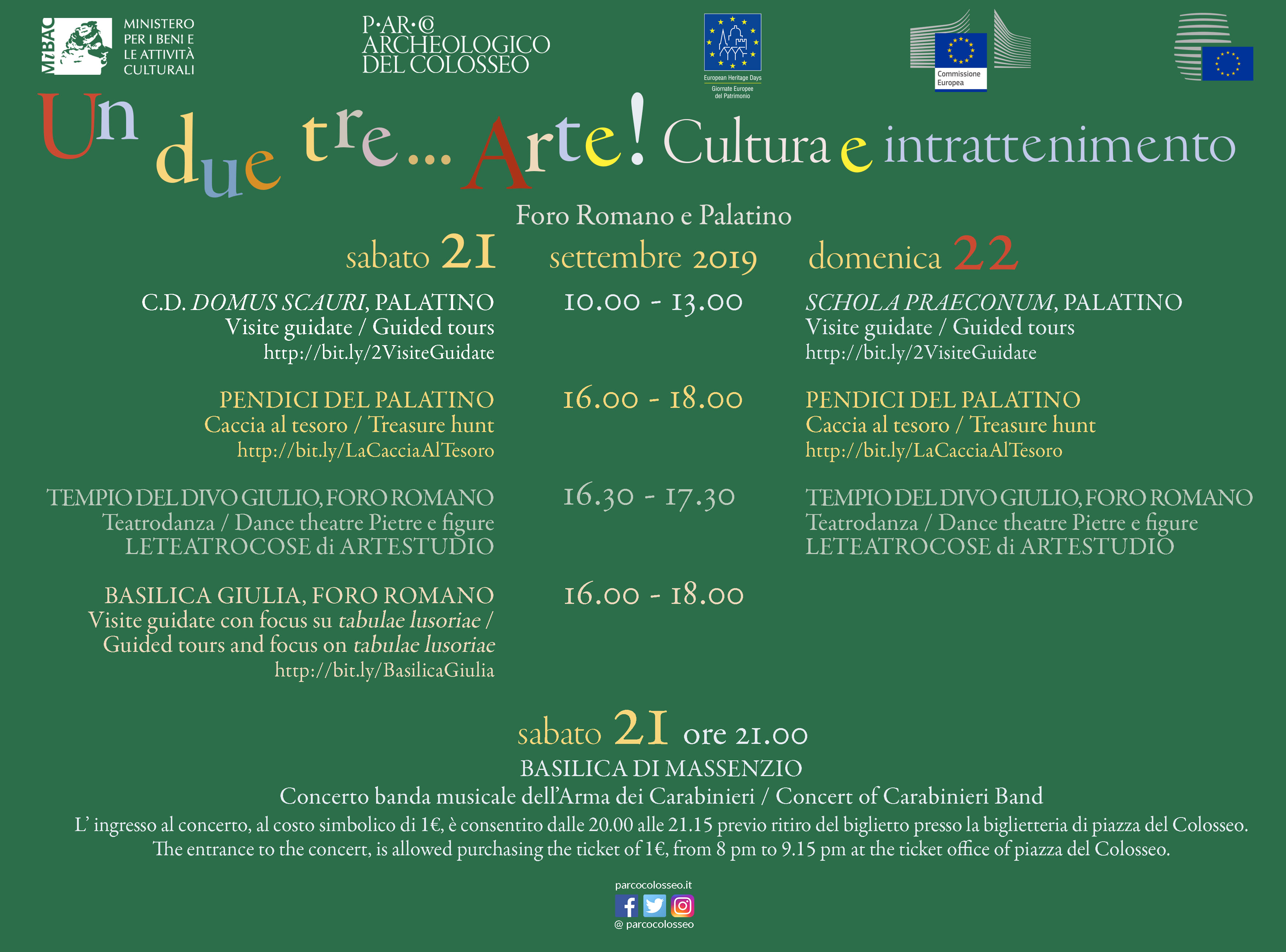 Il Parco archeologico del Colosseo in occasione delle Giornate Europee del Patrimonio 2019 – Un due tre…Arte! Cultura e intrattenimento propone una serie di eventi straordinari, rivolti ad adulti e bambini, anche in lingua inglese. Aperture straordinarie, visite guidate, cacce al tesoro e spettacoli permetteranno di conoscere e vivere la storia e l’archeologia nel cuore della città.