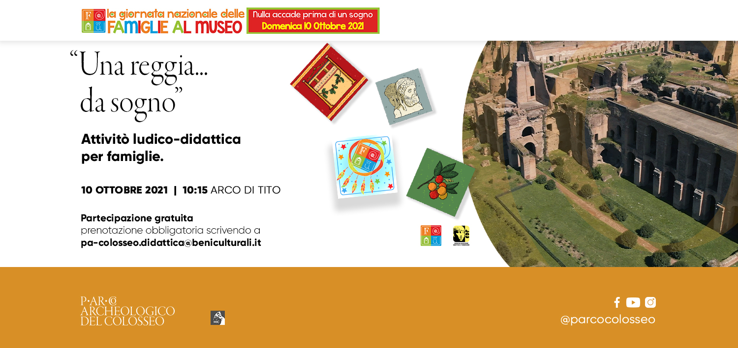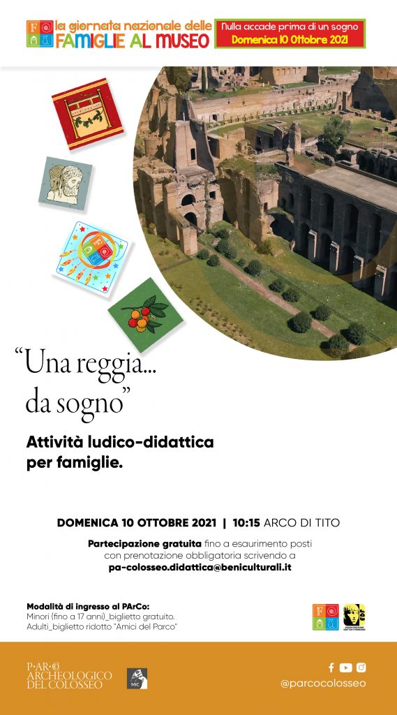 Domenica 10 ottobre 2021, in occasione della Giornata Nazionale delle Famiglie al Museo F@Mu 2021, i bambini e le bambine, insieme alle loro famiglie, sono invitati sul Palatino per allestire la propria ‘reggia da sogno’: attraverso un percorso tra i luoghi più belli del PArCo, scopriranno le meraviglie del Palazzo dell’Imperatore e avranno modo di fare le proprie scelte da arredatori, per creare una reggia ideale!