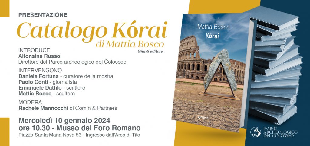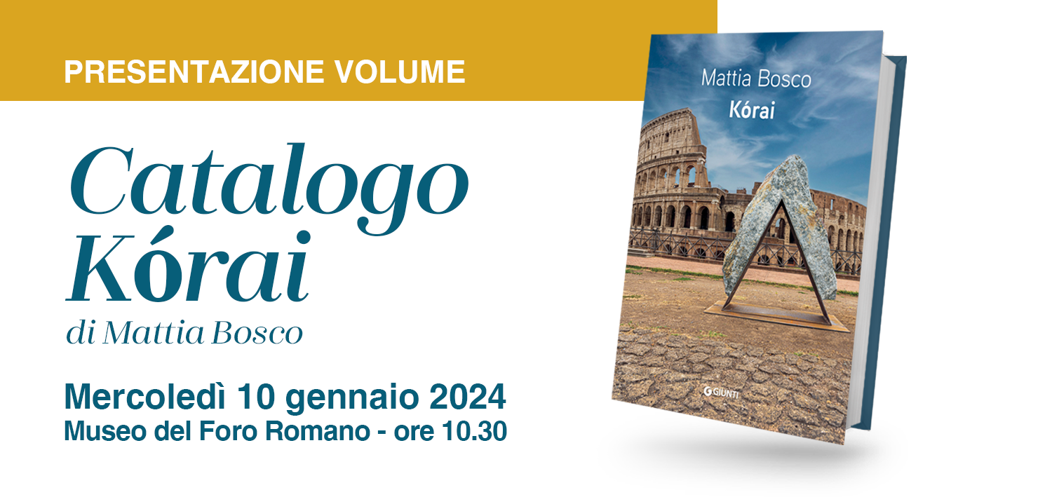 Mercoledì 10 gennaio 2024, alle ore 10.30, il Museo del Foro Romano ospita la presentazione del catalogo di KORAI, mostra personale di Mattia Bosco (Milano, 1976), allestita nei suggestivi spazi del Tempio di Venere e Roma. Il catalogo è edito da Giunti Editore.