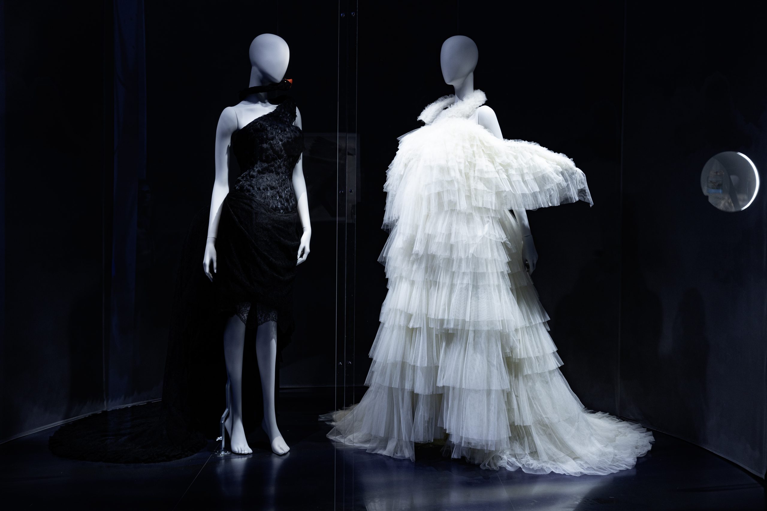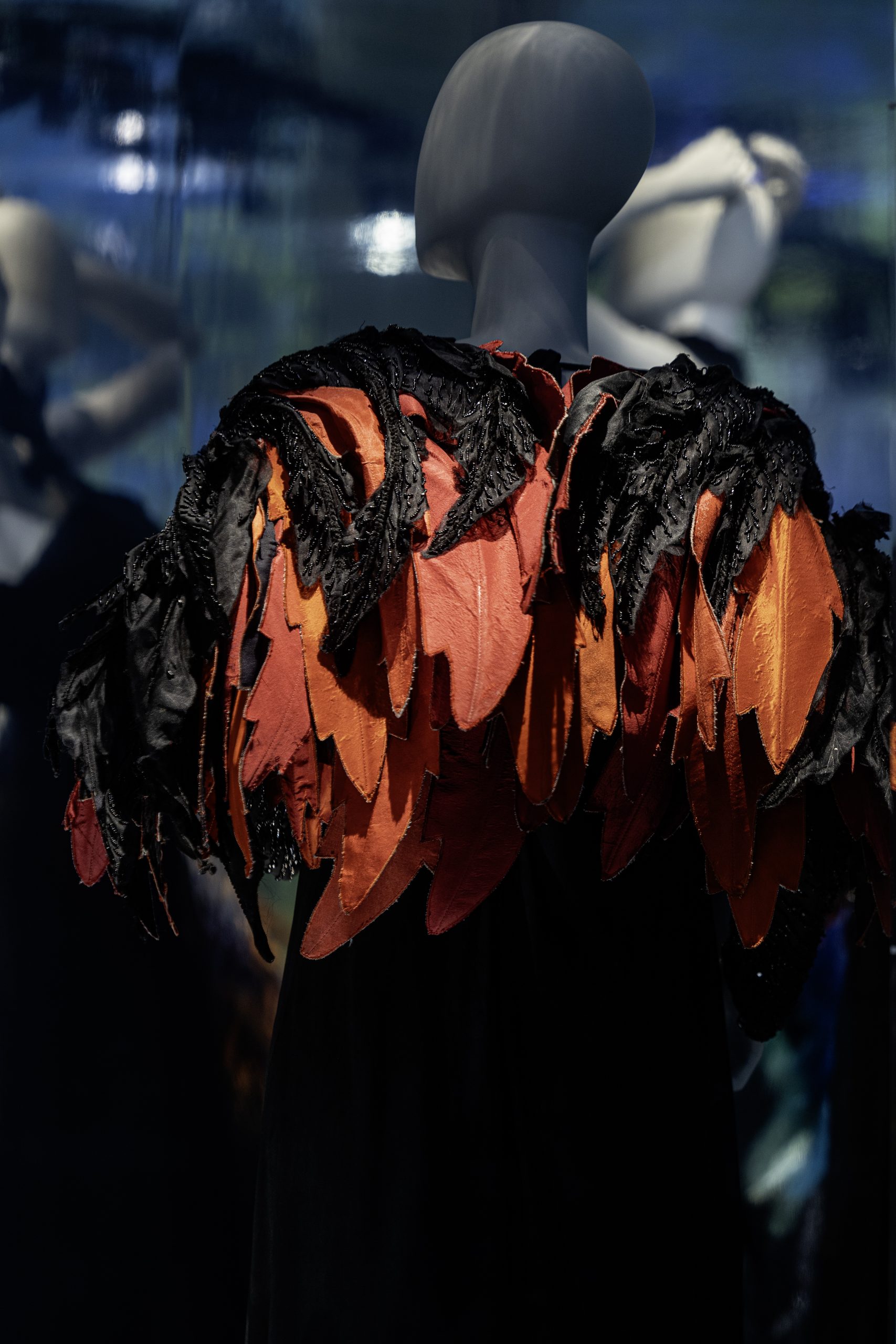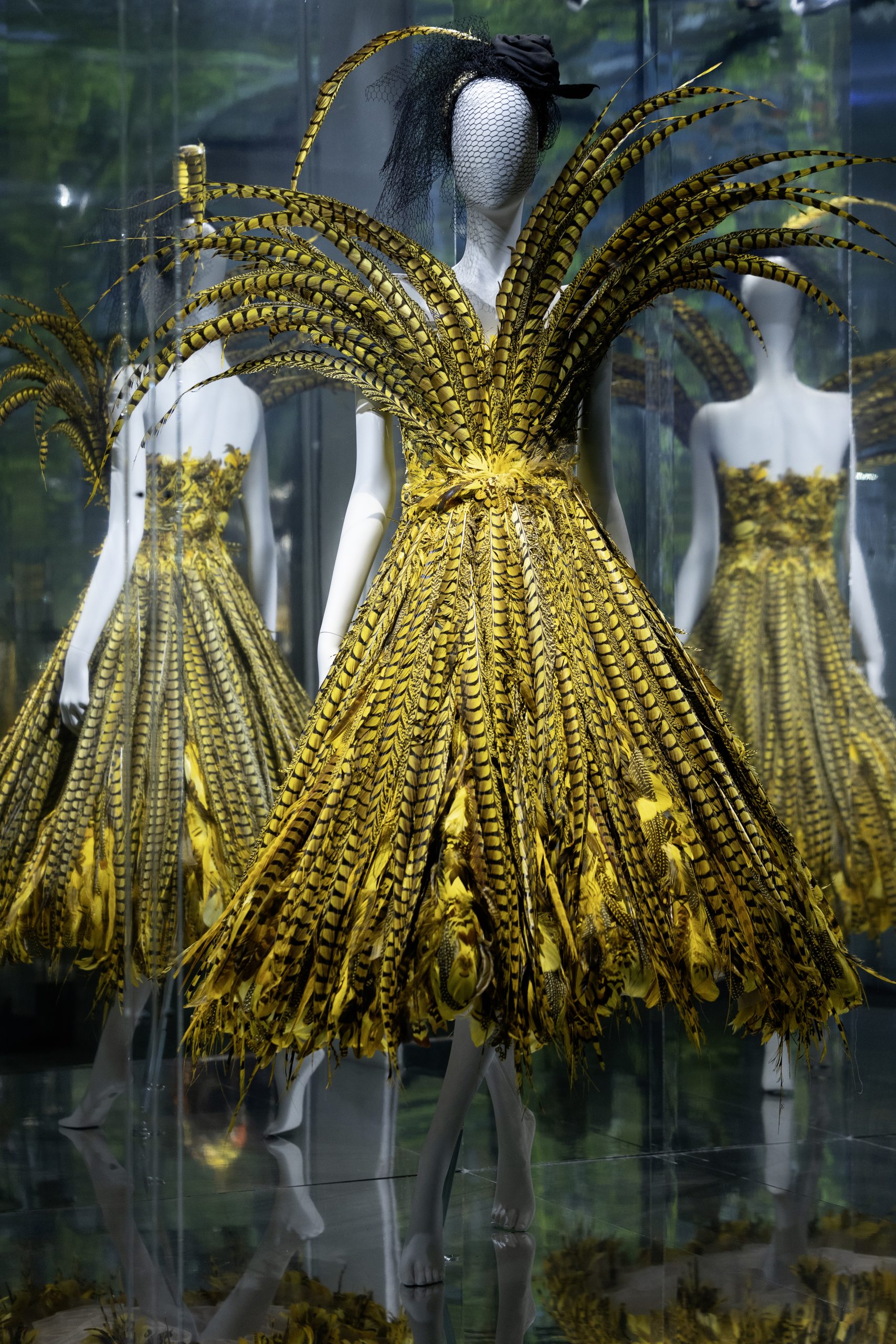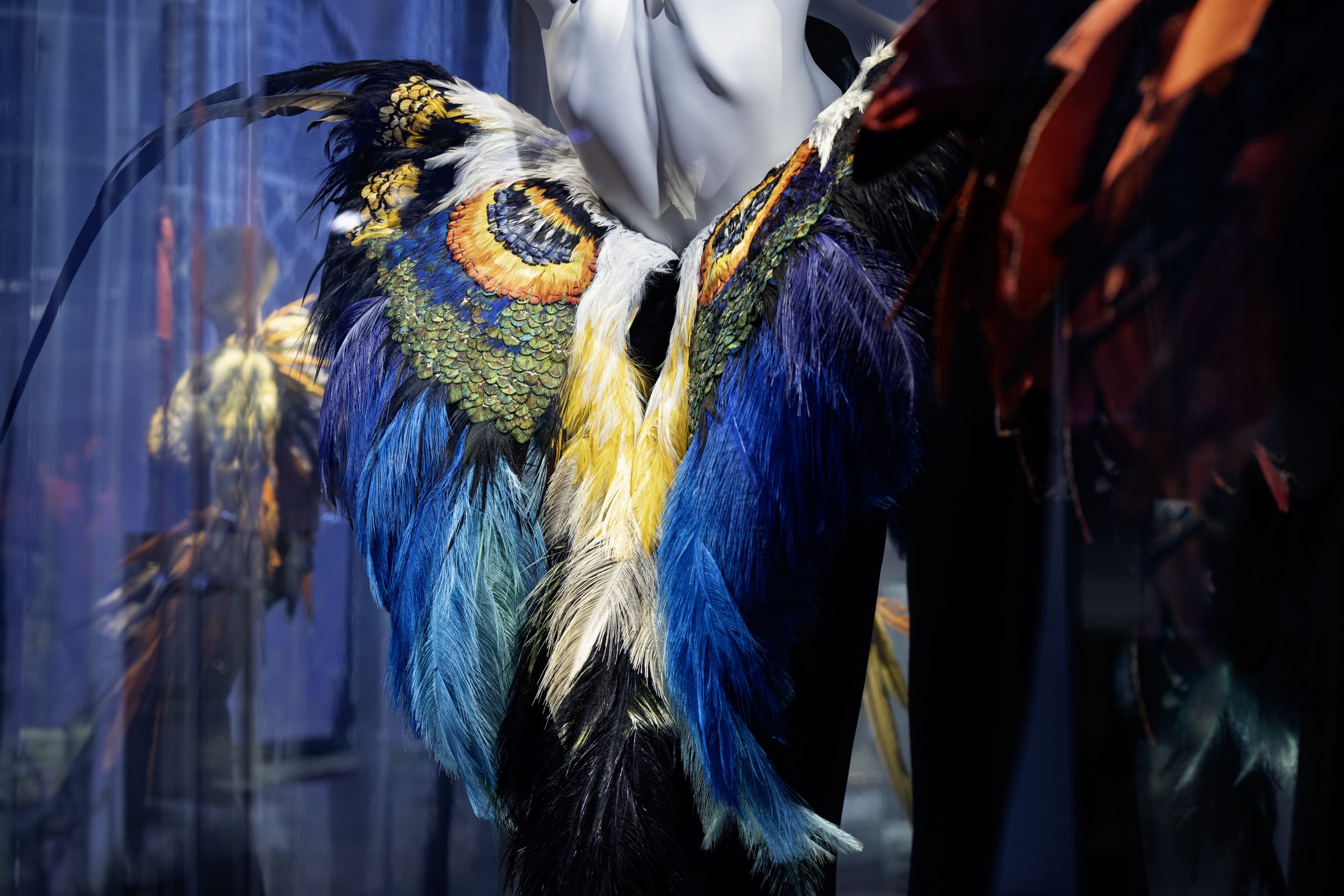 Queste alcune delle meraviglie che è possibile ammirare: il maestoso abito cigno bianco, una spuma di tulle completata da candide ali di Maria Grazia Chiuri per Christian Dior (Cruise, 2022); l’abito cigno nero, che riporta alla memoria la Odile di Il Lago dei Cigni di Tchaikovsky, di Alexander McQueen per Givenchy (haute couture autunno-inverno 1997); l’abito-corsetto in organza, interamente ricamato con piume di gallo e di fagiano, della Collezione Firenze 2020 di Dolce&Gabbana Alta Moda; il lungo abito nero, guarnito sul retro da una cascata di caleidoscopiche piume di Thierry Mugler (haute couture autunno-inverno 1997); il micro-abito dorato, in metal mesh ed enormi ali di piume di struzzo disegnato da Donatella Versace appositamente per Katy Perry e dai lei sfoggiato sul tappeto rosso del Gala del MET nel 2018; il look esclusivo realizzato da Alessandro Michele per Gucci con ricami in cristalli 3D e indossato da Florence Welch, al MET Gala del 2019, così come la mise, con bolero pappagallo, della prima sfilata haute couture di Jean-Paul Gaultier (autunno-inverno 1997). Un posto speciale merita inoltre l’abito “Vittoria del colibrì”, progettato appositamente per “Rara Avis” da Tiziano Guardini, realizzato in seta non violenta e dedicato al tema della sostenibilità.