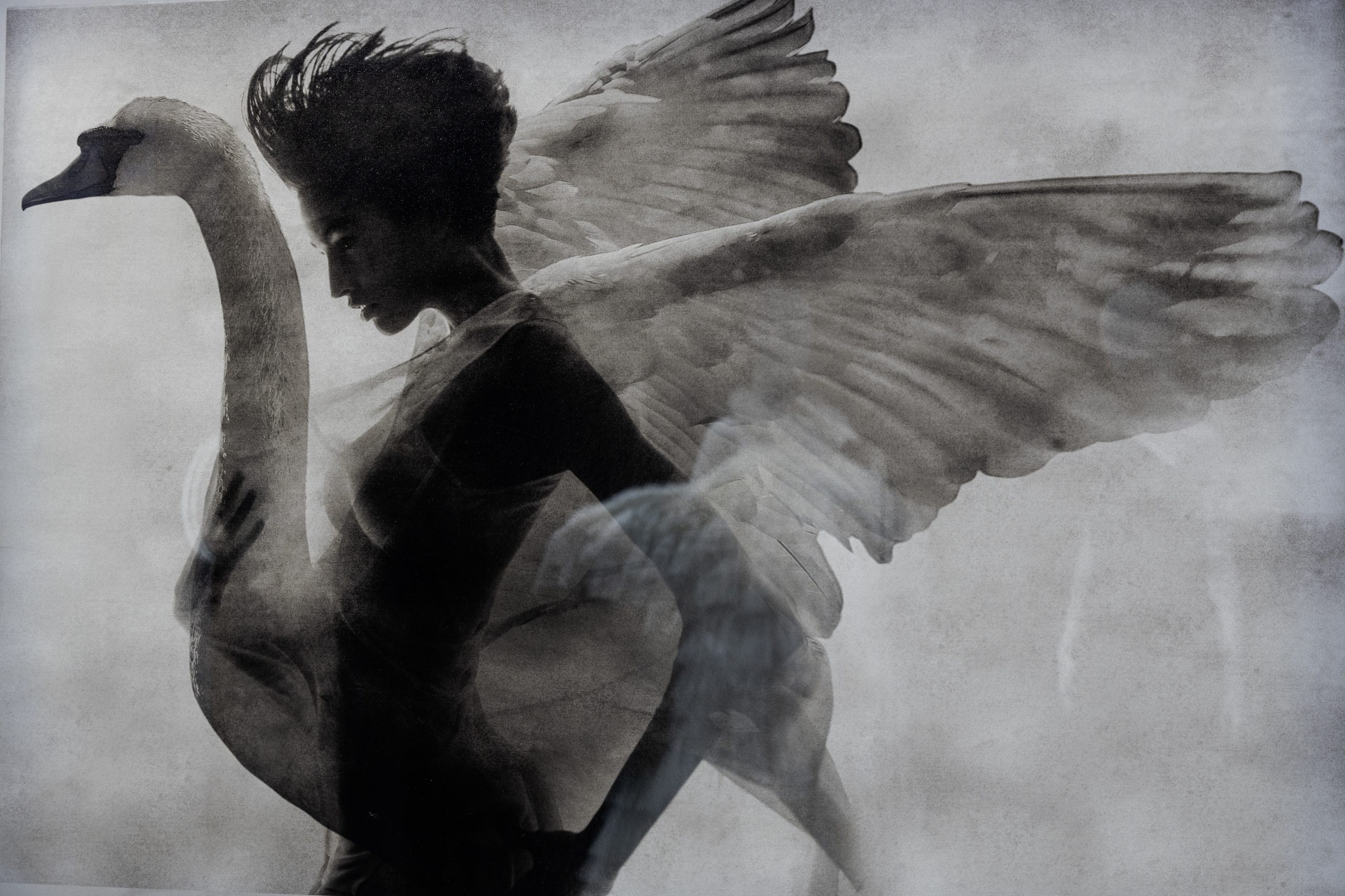 La sezione dedicata al “Mito” e al divino, ‘popolata’ di abiti-uccello bianchi, neri e oro, si apre con un omaggio a Giovanni Gastel e al suo scatto Zeus in forma di cigno e Leda (1990).