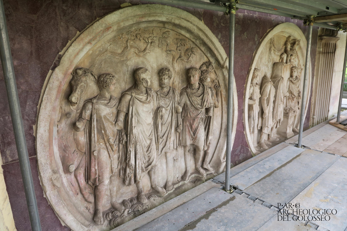 L’Arco di Costantino è stato oggetto di diversi interventi di restauro e manutenzione, a partire dagli anni Cinquanta, con interventi strutturali volti alla messa in sicurezza dell’ordine libero di colonne all’epoca del Soprintendente alle antichità Pietro Romanelli e la qualità degli interventi eseguiti a partire dagli anni Ottanta e principalmente dedicati alla conservazione delle superfici, ha garantito la buona conservazione delle superfici fino ad oggi, trasmettendo il monumento in buone condizioni nonostante l’esposizione al traffico veicolare e agli agenti atmosferici, due tra i principali fattori di deterioramento delle superfici dell’arco. Se l’esposizione di un lato dell’arco a Sud da un lato inibisce la formazione di microrganismi vegetali, dall’altro favorisce la cristallizzazione di sali solubili sulle superfici, che favoriscono la progressiva disgregazione del marmo. Al contrario, la mancanza di irraggiamento solare del fronte Nord facilita lo sviluppo dei microorganismi e riduce i fenomeni di disgregazione del marmo. L’intervento recentemente concluso ha interessato i fronti Nord ed Est, sui quali si era formato uno spesso strato di patine algali dannose per la conservazione del marmo e per la visione del monumento poiché non permetteva di apprezzare i marmi policromi dell’arco.