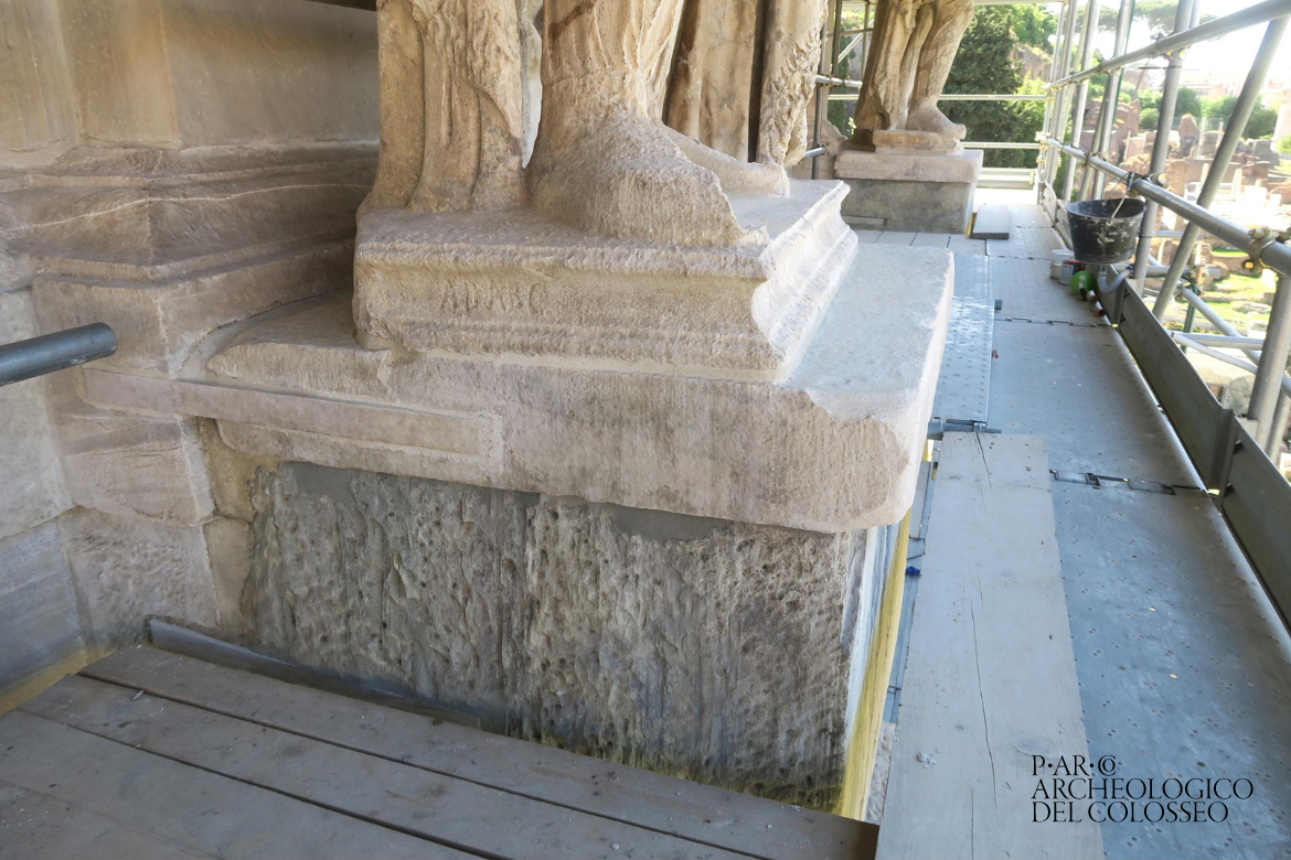 Oltre alle patine biologiche l’arco subiva l’infiltrazione di acque meteoriche, la perdita di funzionalità di stuccature e lo sviluppo di licheni che danneggiavano le superfici esteticamente e materialmente, attaccando il marmo sottostante. Erano presenti zone in cui il marmo era disgregato e mostrava segni di polverizzazione; inoltre le parti più aggettanti dei rilievi erano diventate appoggio per volatili che le avevano coperte di guano, deiezione pericolosa perché aggredisce chimicamente la pietra. La deposizione di polveri atmosferiche nelle aree più riparate e non dilavate dalla pioggia sporcavano le superfici e attivavano la formazione di croste nere, una forma di degrado che erode e polverizza il marmo.