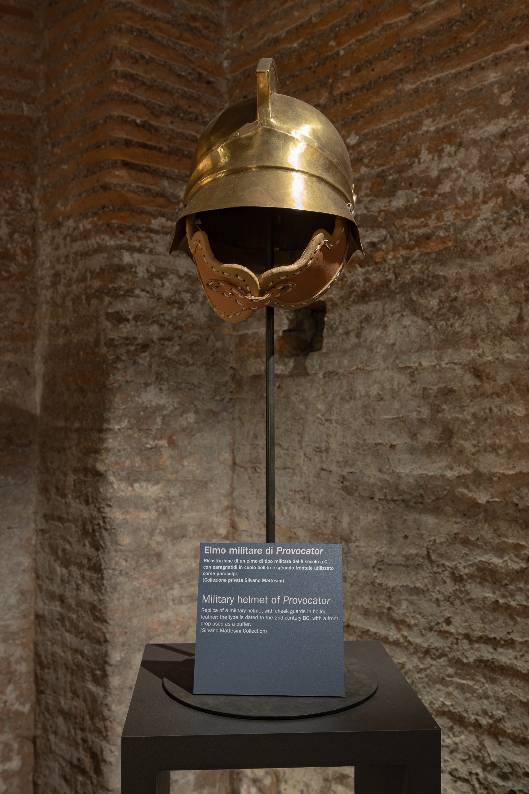 展出的青铜铸造头盔具有一个半球形壳体,防御帽沿宽大,不同于其他角斗士头盔的是,它的帽沿显得更笔直,在靠近帽壁处有轻微的皱褶。脸甲覆盖整个脸部,仅在眼睛处开了两个孔,并带有格栅保护。这一细节可让我们断定这是儒略-克劳狄时期的头盔。头盔正面绘画了一棵棕榈树,暗示战斗结束时授予胜利者的“双扭棕榈(palma lemniscata)”。青铜护目镜上绘有两面小圆盾(parmae)和两杆交错的长矛,顶部则有一个狮鹫的头。几乎可以肯定的是,这些符号属于霍普马科斯角斗士,或色雷斯角斗士(二者都是持小盾者(parmulari),因为使用小盾parmulae)。在头盔(galea)的两侧清晰可见放置长羽毛的“小杯”,而在防御帽沿下方,可看到青铜加固件,用于抵御来自侧面的袭击。这顶头盔是一件复制品,使用来自庞贝角斗士兵营的公元一世纪原始模具制造,这件模具如今收藏于那不勒斯国立考古博物馆。