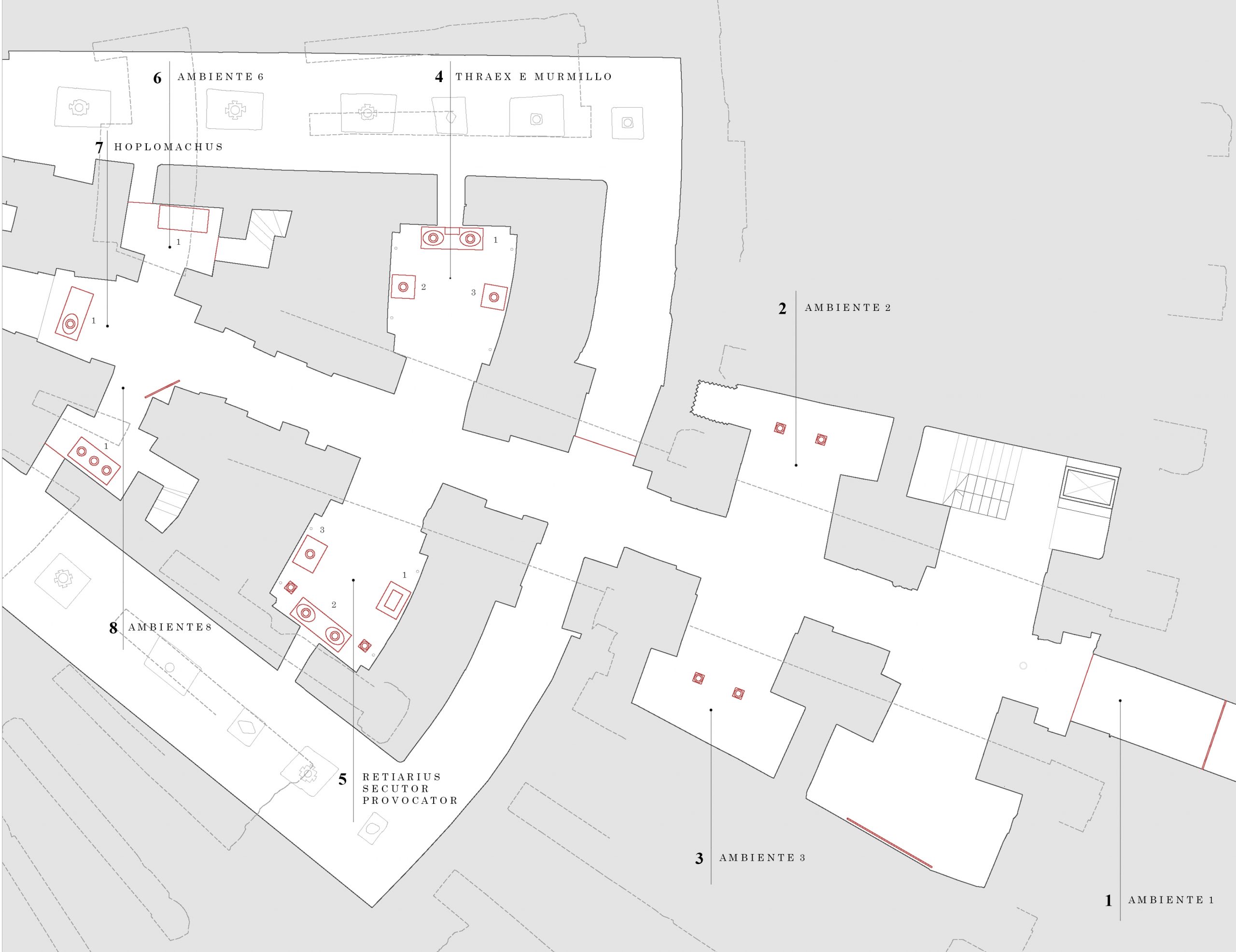 被发掘出土的有14个房间遗址。每个房间占地约20平方米。据估算,这所训练学校内可容纳一千名角斗士。